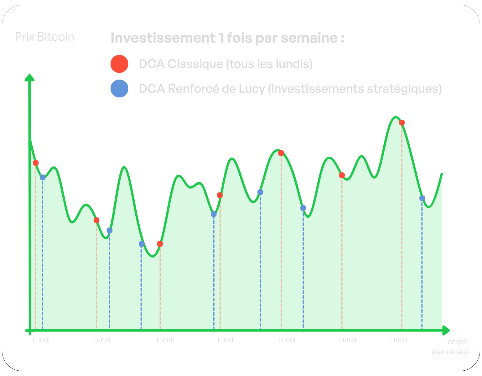 Avec un DCA classique (points rouges), tu investis chaque semaine, dans les bonnes zones mais aussi dans les mauvaises zones.