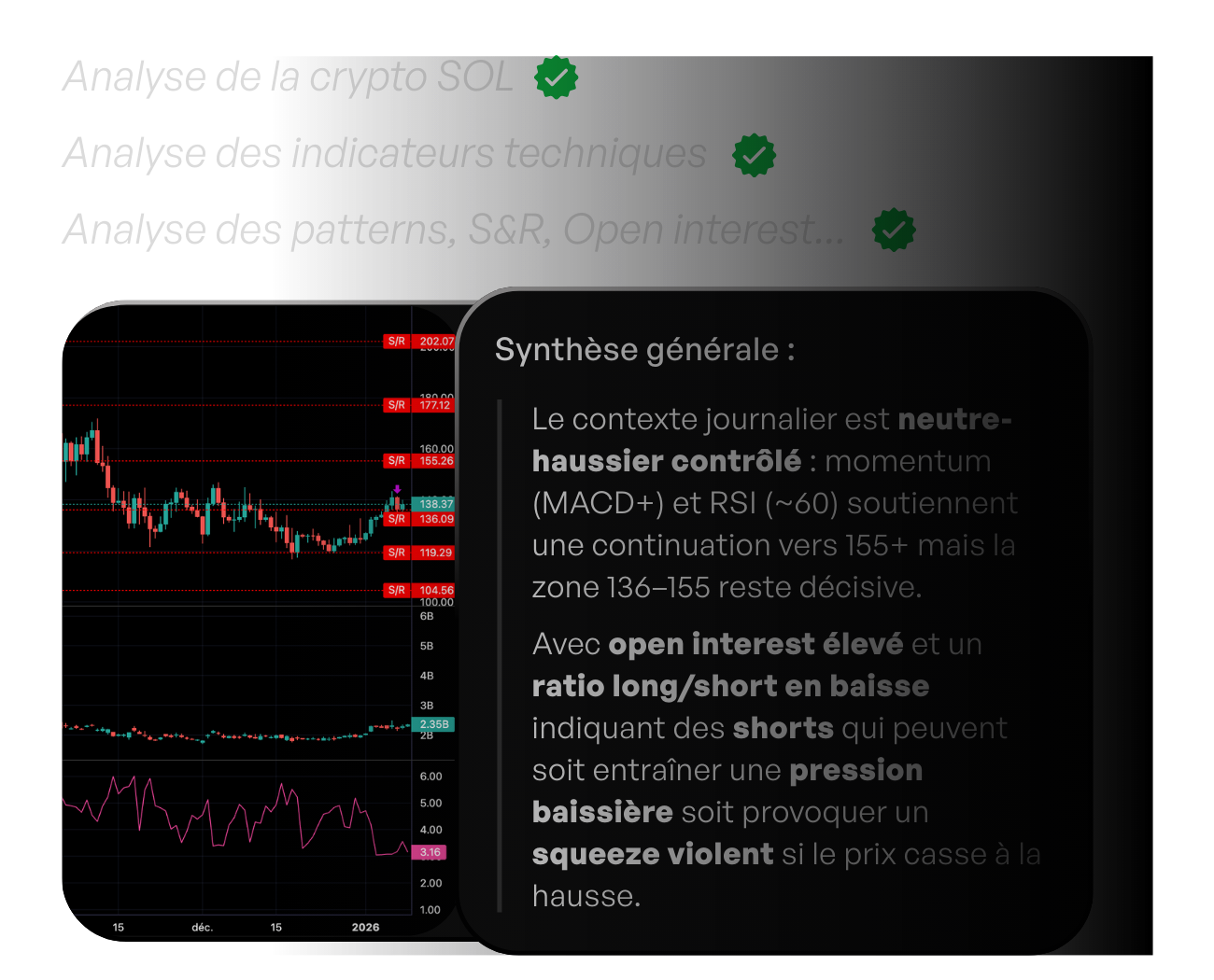 Prix, volumes, indicateurs, divergences, volatilité, patterns : tout est récupéré, filtré et comparé instantanément. L’IA assemble ensuite ces informations pour créer une lecture cohérente, logique et exploitable.